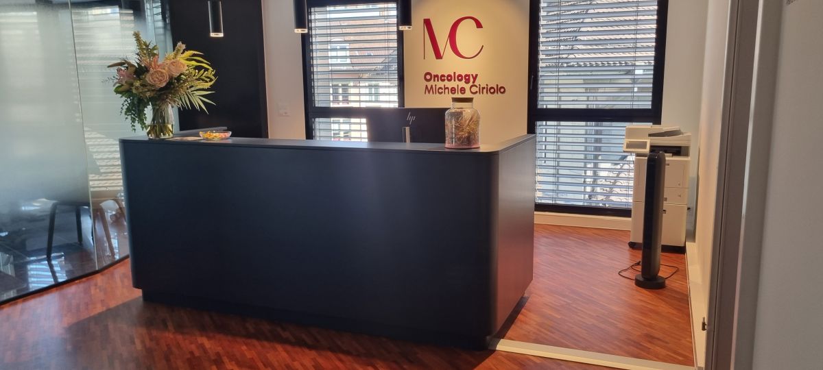 Empfang, Schränke und vieles mehr in einer Arztpraxis für Onkologie.